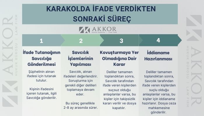 Karakolda ifade verdikten sonraki süreçte, Cumhuriyet Savcısı soruşturmaya devam eder ve ifade veren kişi hakkında dava açılıp açılmayacağına karar verir.